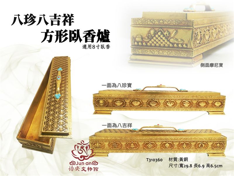 適用8寸以內臥香。 爐身一面為八珍寶,另一面為八吉祥;側邊為摩尼寶,精緻的做工十分莊嚴,是您供佛上選。 注意事項:商品皆為實物拍攝,如有色差以實物為準 敬請見諒~